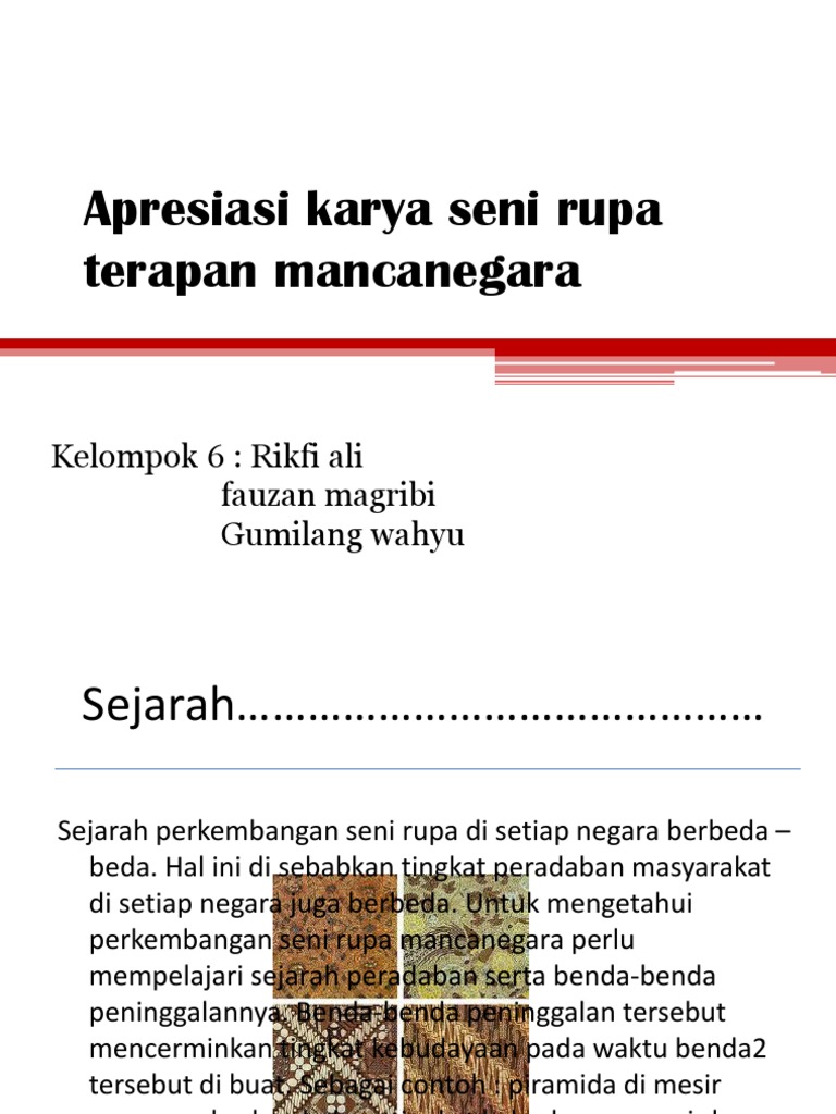 Makalah karya seni rupa manca negera cina. Karya seni terapan ada yang bentuknya 2 dimensi dan ada juga yang 3 dimensi. Salah satu contoh hasil dari karya seni rupa murni yaitu lukisan, kaligrafi dan patung. Pengertian seni rupa terapan dan contoh gambar seni rupa terapan contoh dari seni kriya kayu ini adalah wayang golek patung topeng dan hiasan ukiran yang lainnya. Contoh seni kriya mancanegara dan penjelasannya. Karya seni rupa yang dihasilkan dari peradaban tertua mencanegara ditemukan di india, kemudian mesir, tiongkok, persia, yunani dan romawi. Kriteria menilai karya seni rupa terapan (seni kria) suatu karya seni yang tergolong ke dalam seni rupa tentu dalam pengerjaannya memperhitungkan kaidahkaidah seni rupa, maka dalam menilai atau memilih suatu karya seni rupa yang baik dan berkualitas diperlukan apresiasi seni rupa. Menilai karya seni rupa terapan (seni kria) menilai suatu karya seni kria, kita harus memahami proses apresiasi seni rupa secara utuh. Pengertian seni rupa mancanegara menurut para ahli seperti yang dikutip pada laman world’s fine art ialah terkait bagaimana seniman dunia membuat seni rupa dua dimensi maupun tiga dimensi yang mengekspresikan ciri khas negaranya.
